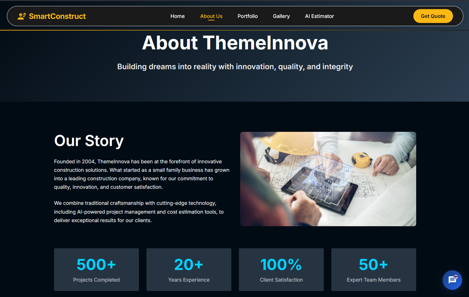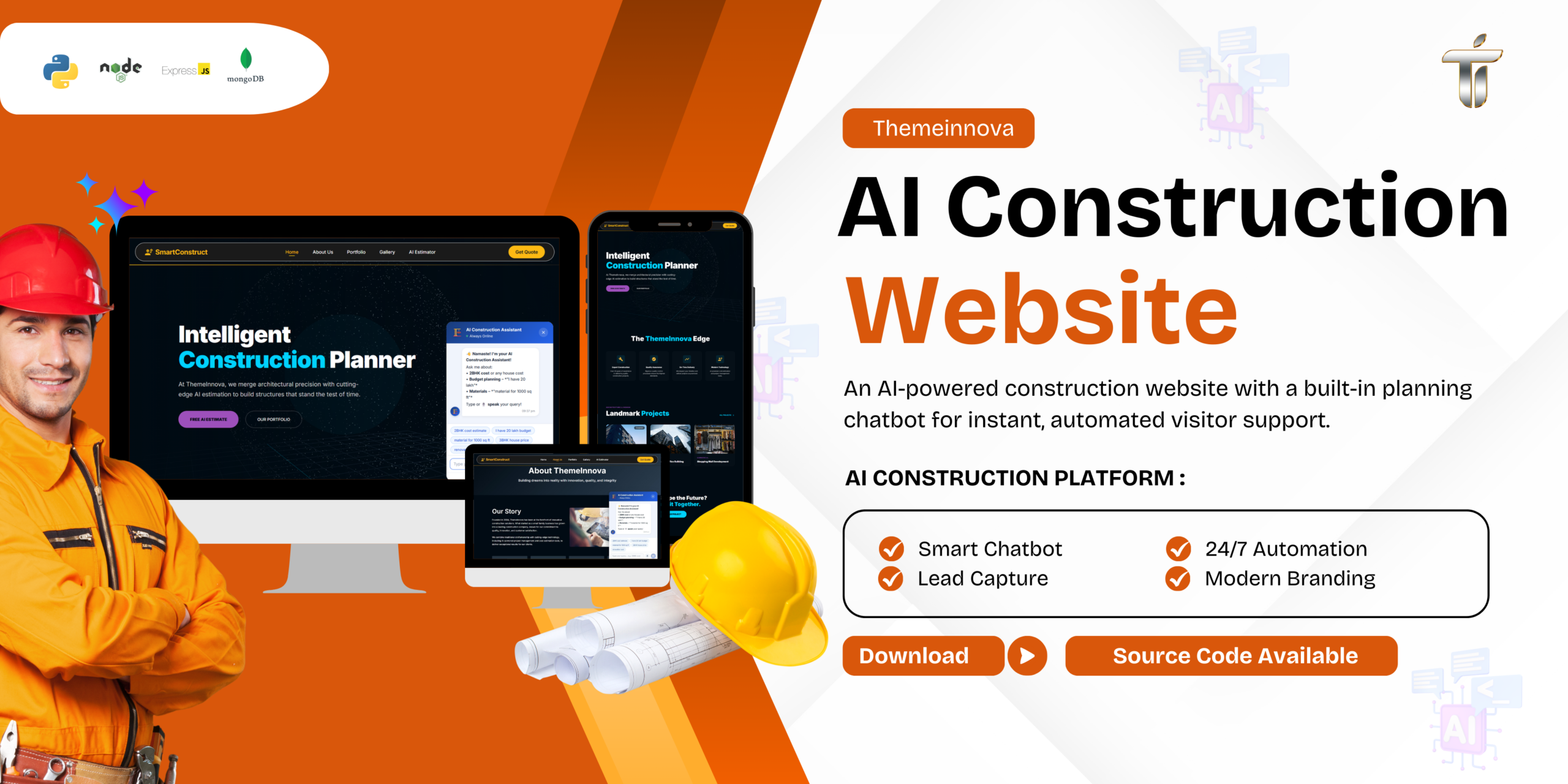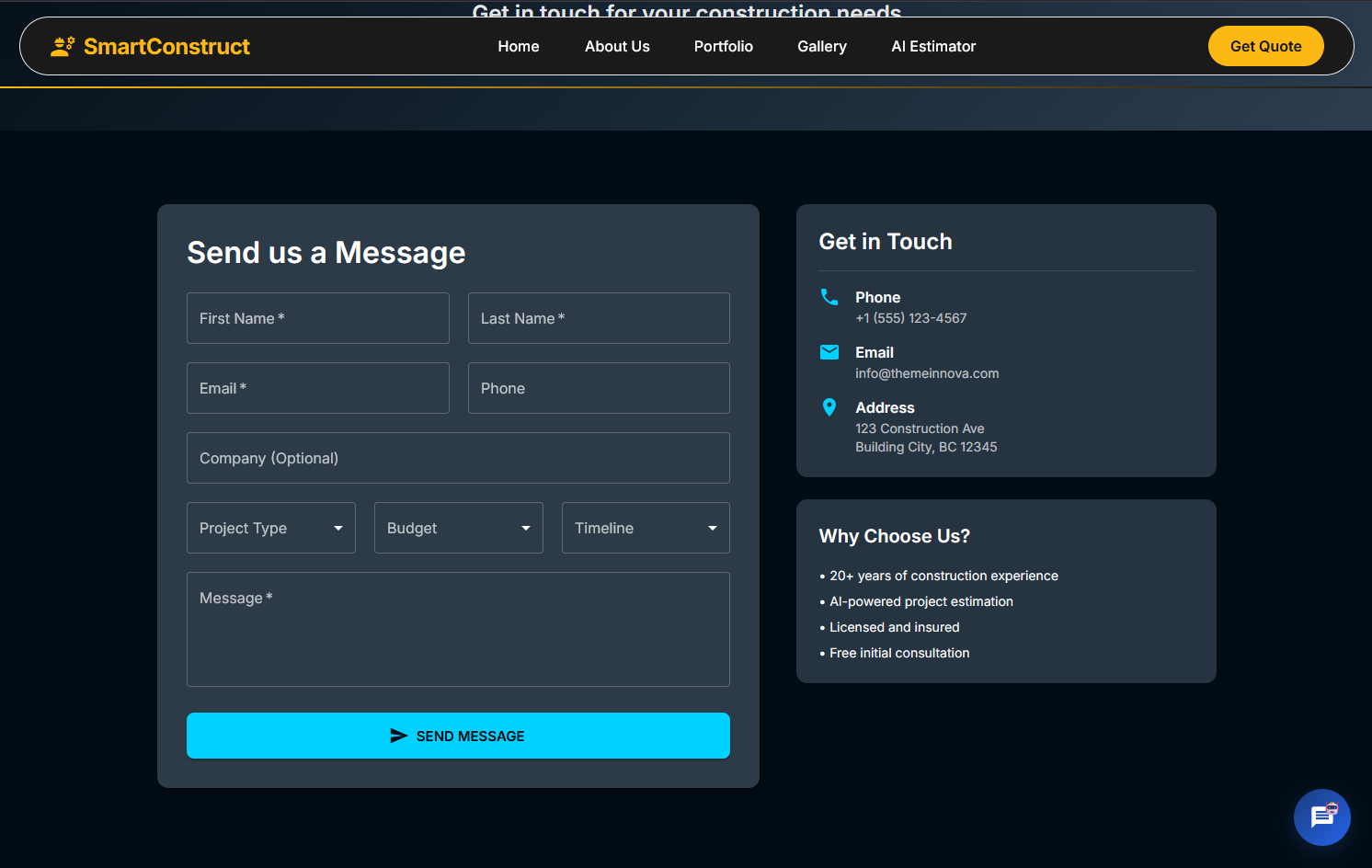 The AI Construction Website combines a professional construction layout with an integrated planning chatbot. It allows construction companies to provide instant assistance to visitors without manual intervention.