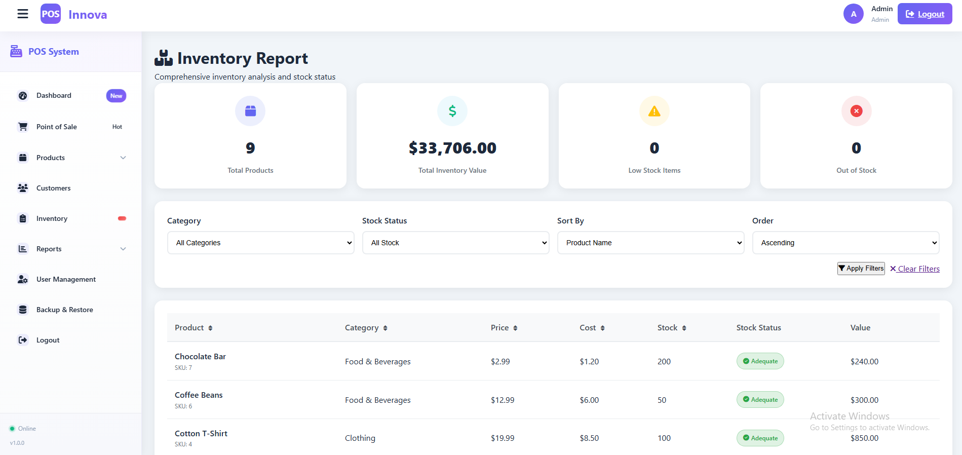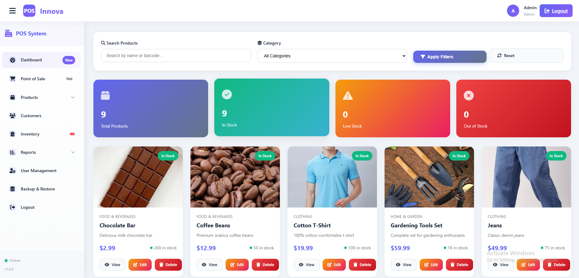 Stock Alerts (In Stock, Low Stock, Out of Stock).