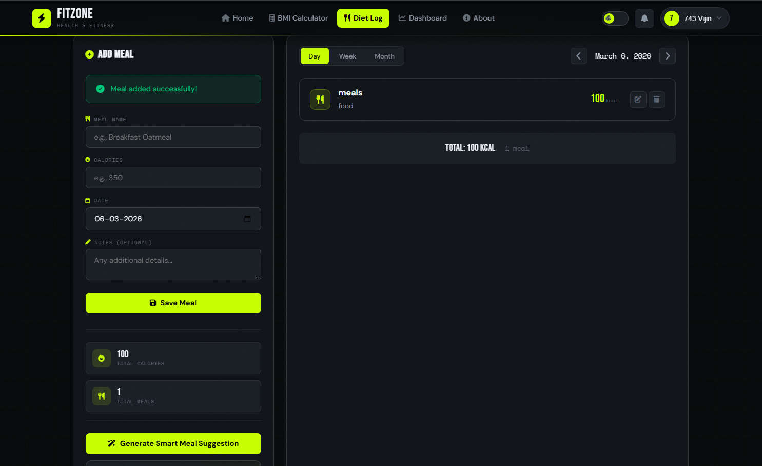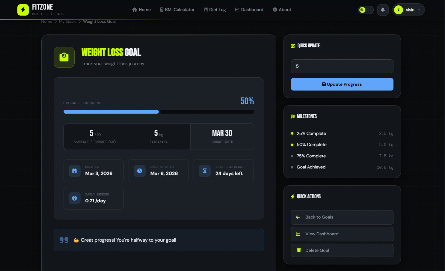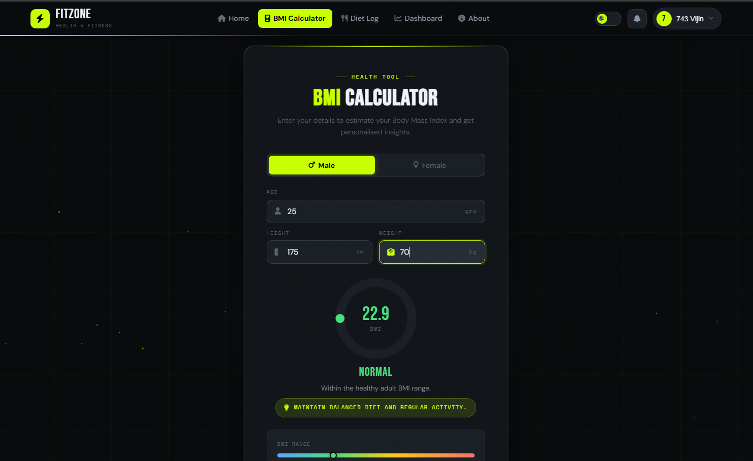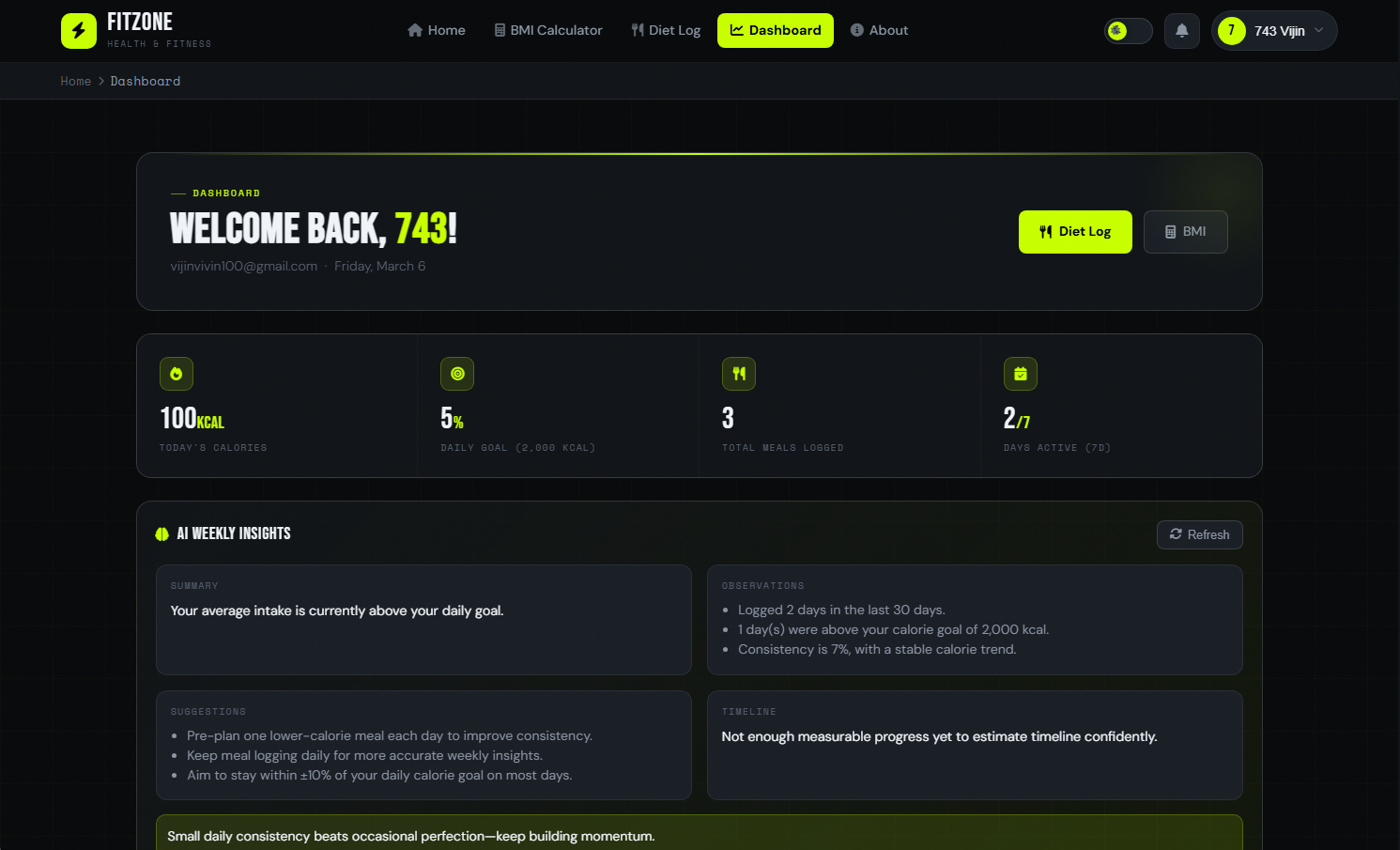 It combines goal tracking, diet monitoring, BMI tools, and AI coaching insights inside a clean and modern dashboard.