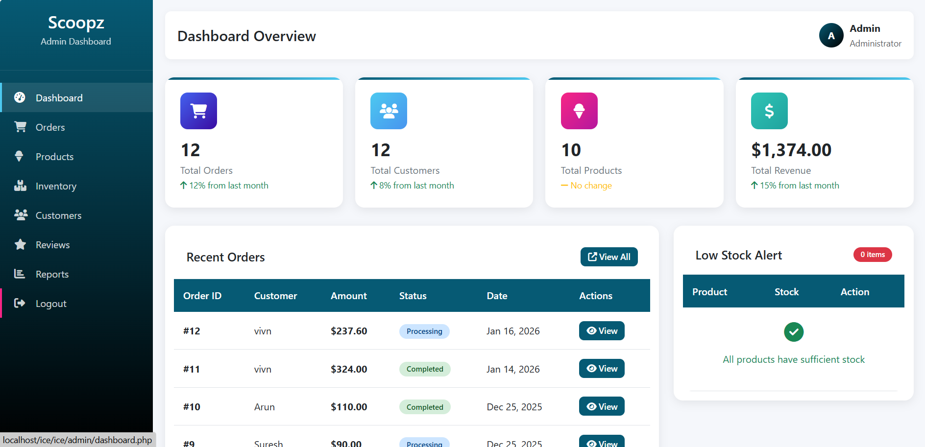 The Online Ice Cream Ordering System is a complete web-based application developed using PHP and MySQL that enables ice cream shops and small businesses to sell products online efficiently. Customers can browse ice cream products, add items to a cart, and place orders online with ease.